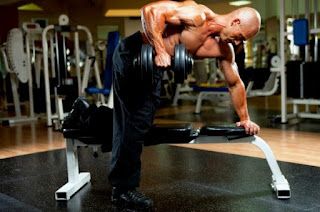 Satu tangan bertumpu pada bench dan satu tangan pegang dumbbell